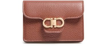 Unveil Ferragamo's Gancini key holder, crafted from exquisite grained leather. This wallet features a magnetic closure, ensuring your essentials are secure. Its visible topstitching and front logo, complemented by a sophisticated gold finish, highlight the brand's impeccable craftsmanship.