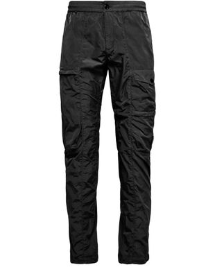 CP Company's Chrome-R Lens cargo pants offer a slim fit with a low-waisted design, featuring back darts and visible stitching for a tailored look. An elasticated waist ensures comfort, while ankle length and welt pockets add practicality. A back pocket completes these casual pants, perfect for effortless style and functionality.