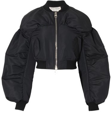 With an undeniably on-trend ultra-tight waist and puff sleeves, this Couture bomber jacket by Alexander McQueen features a zipper closure with a zipped pocket on the sleeve.