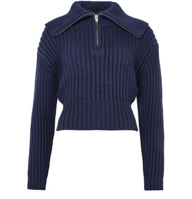 Reveal Acne Studios' crew-neck sweater, a modern knitwear piece featuring a funnel neck and long sleeves. The ribbed texture and embroidered logo at the back add a touch of sophistication. With its zipper closure and cropped length, this sweater is perfect for layering over your favorite outfits.