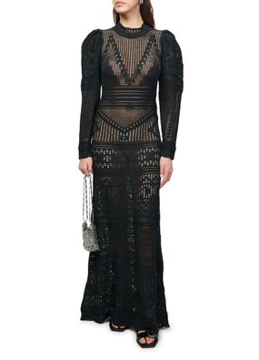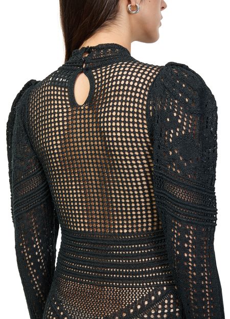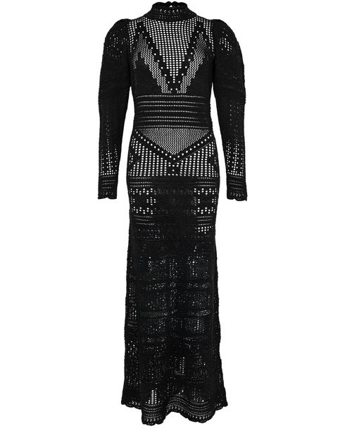 Reveal Isabel Marant's Dione maxi dress, crafted in open weave for a refined texture. The high-neck and gigot sleeves create a striking silhouette, while geometric details add a modern edge. This long, knitted piece transitions effortlessly from day to evening, making it a versatile statement for any occasion.