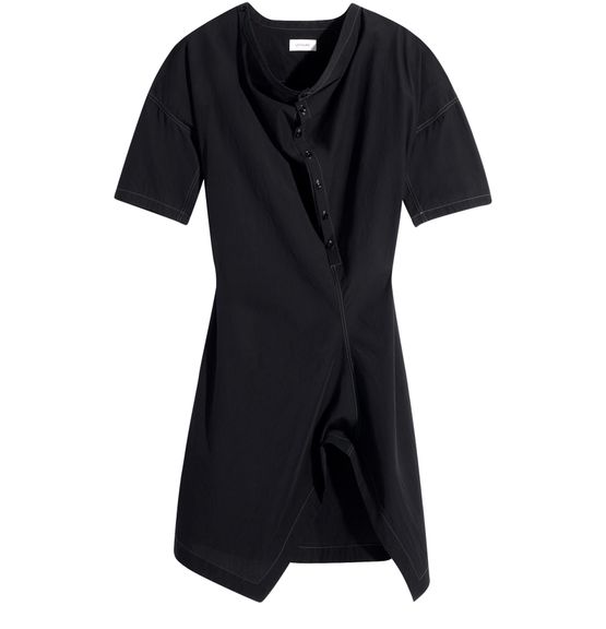 Reveal Lemaire's draped dress with soft collar, featuring a knee-length silhouette and a refined draped neckline. Short sleeves with dropped shoulders and a front buttoned closure add a modern touch, while the asymmetric cut and visible stitching create a distinctive look. A front slit completes this versatile piece.