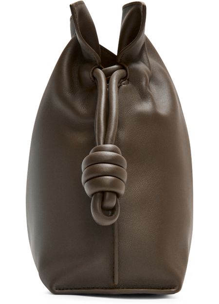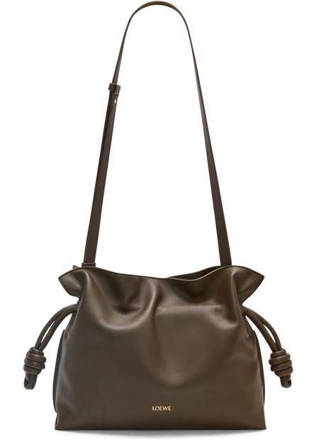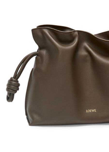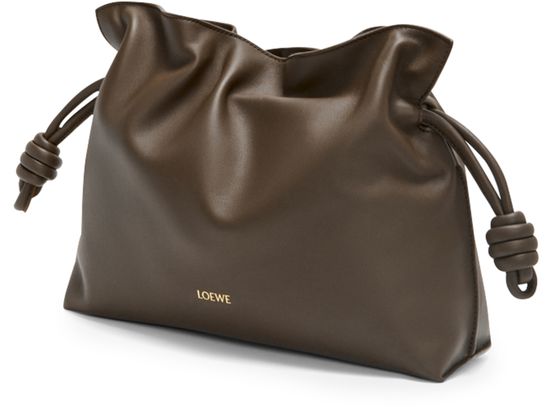 Reveal Loewe's Medium Flamenco clutch in nappa calfskin, featuring an oversized Pebble fastener and smooth leather for a refined touch. The wide, detachable strap and single handle offer versatile carrying options, while visible topstitching and a front embossed logo highlight exceptional craftsmanship.
