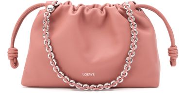 Reveal Loewe's medium Flamenco bag in mellow nappa lambskin, crafted from smooth leather with a refined chain strap. The drawstring closure and front logo add a modern touch, blending signature detailing with functional elegance for a statement shoulder bag.