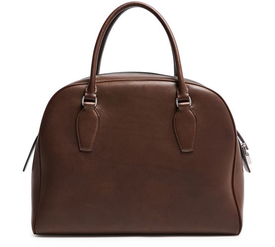 Introducing The Row's India 12 handbag, a masterpiece of modern elegance. Crafted from smooth leather, this shoulder bag features double handles and a large interior compartment. The zippered interior pocket and visible topstitching add functional sophistication, while the embossed logo and silver finish complete its refined allure.