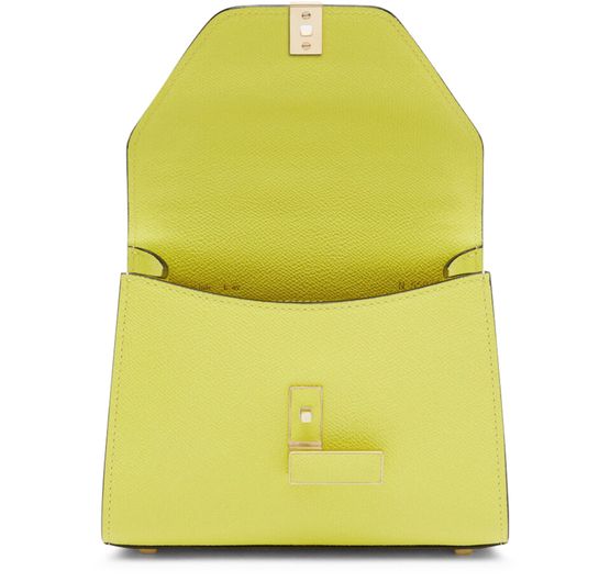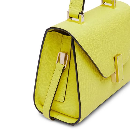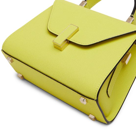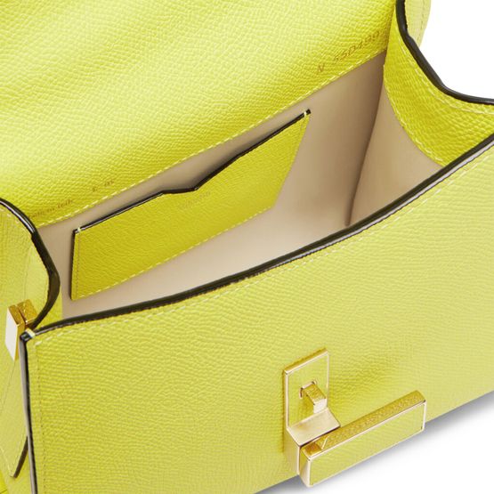 Reveal Valextra's Iside micro bag, crafted from grained leather with a refined gold clasp and gold finish. The single handle and thin, adjustable strap offer versatile styling, while visible stitching and interior patch pockets highlight thoughtful design and functional elegance.