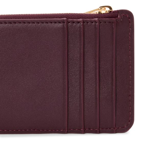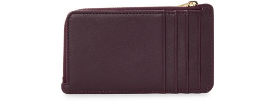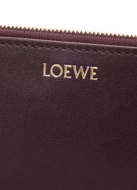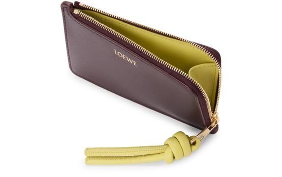 Reveal Loewe's Knot card and coin holder, crafted from shiny nappa calfskin with a gold logo accent. The visible stitching and contrast lining highlight refined craftsmanship, while interior slots and a zipper closure offer practical elegance for your essentials.