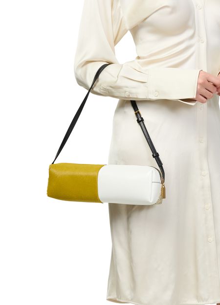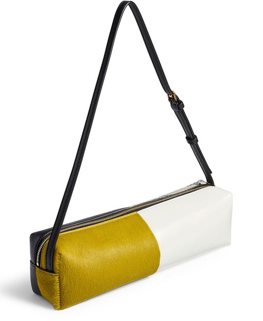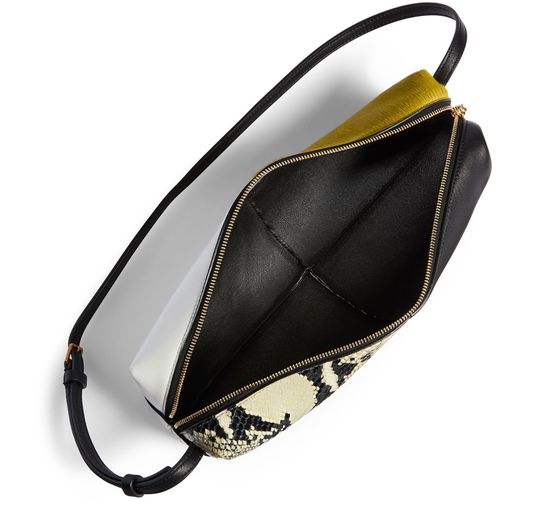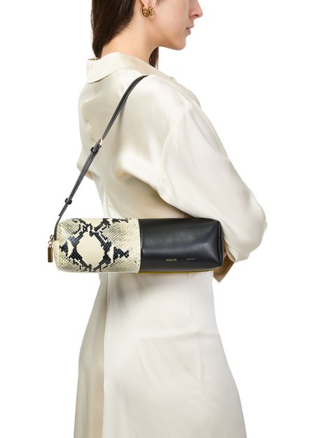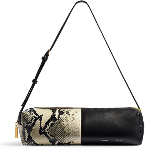 Reveal Khaite Kye shoulder bag, crafted from snakeskin print leather with a smooth finish. The adjustable thin strap and single handle offer versatile styling, while gold-finish hardware and visible stitching highlight refined details. A front logo and secure zipper closure complete this modern, sophisticated accessory.