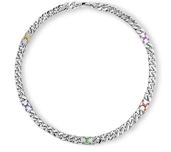 The House’s Tied Up links interlock with a Cuban chain in the finely crafted LV Mosaic Necklace. LV Initials and Monogram motifs in colorful enamel punctuate the piece with a playful elegance. An on-trend accessory for any masculine wardrobe, the necklace comes from a line that includes a coordinating bracelet and a series of rings in bright hues.
