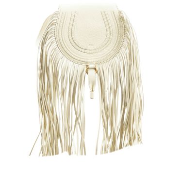 Casual style and confident femininity define the liberated Chloé woman. The rounded lines and long leather fringes on the Marcie mini handbag are inspired by the 70s. It is made in a surprising ivory coloured grained calf skin. Wear cross body or over the shoulder with flared jeans and a printed silk shirt.