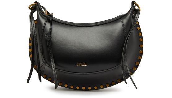 Isabel Marant's Mini Moon Soft Handbag features a gold finish with logo in gold letters and printed logo on the front. It has studded details, a single compartment, and can be worn on the shoulder with a thin strap or single handle. The bag closes with a zipper closure.