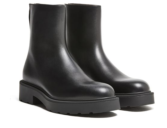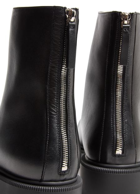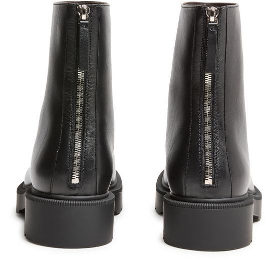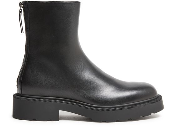 Reveal The Row's Nobilis Fast ankle boots in leather, featuring a sleek round toe and a convenient back zipper. Crafted from smooth leather, these boots boast a low block heel and a thick outer sole for added comfort. The gold-lettered logo on the insole adds a touch of elegance.