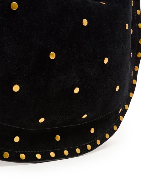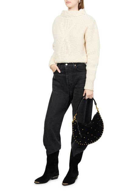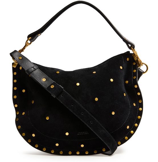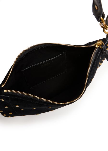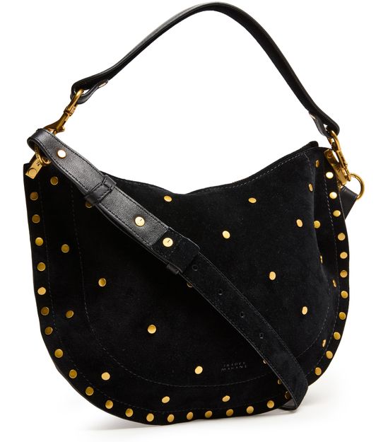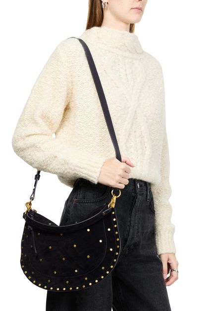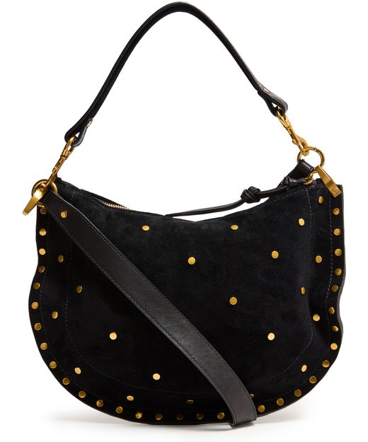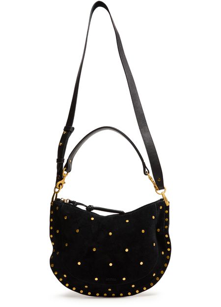 Reveal Isabel Marant's Oskan soft zip bag, a masterpiece of suede craftsmanship. This hobo bag features a single handle and a thin, adjustable strap for versatile wear. Adorned with studded details and a front logo, it offers a single compartment with an interior pocket, all secured by a zipper closure.