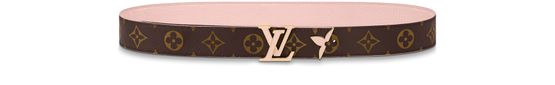 The Pretty LV Enamel reversible belt offers an eye-catching variation on a creative signature look. Styled in gold-tone metal, the LV Initiales buckle is adorned with glossy enamel in the same color as the leather. A matching cut Monogram Flower end tip creates a striking contrast when the belt is worn with the Monogram canvas side out.