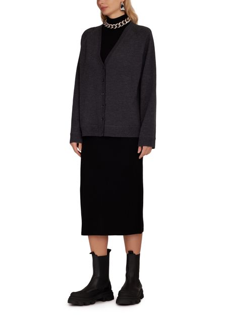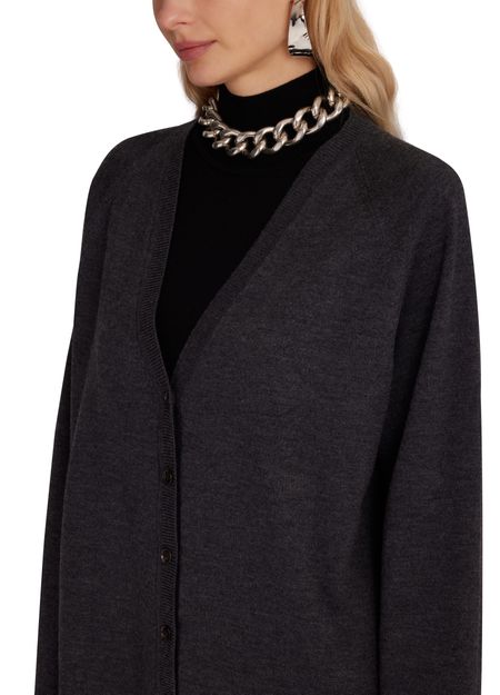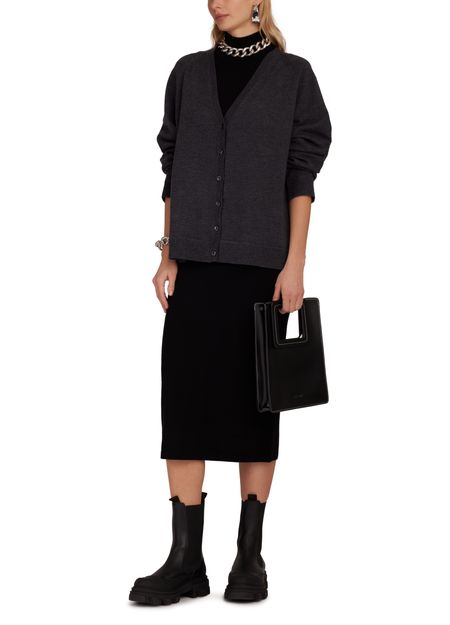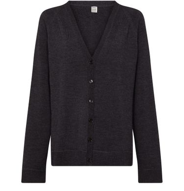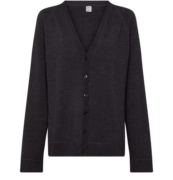 TOTEME cardigan knitted from responsibly sourced, mid-weight wool. It's designed for a boxy fit with a V-neckline, raglan sleeves, a buttoned placket, and finely ribbed edges. Note the embroidered monogram at the front. Balance the volume by cinching it with a belt at the waist.