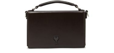 Ami's Sac Lunch Box Ami de Cœur features double handles, visible topstitching, a single compartment, leather handle, flap closure, magnetic closure, worn crossbody or hand carried, thin strap, silver finish, front logo, appliquéd logo, detachable strap, back pocket.