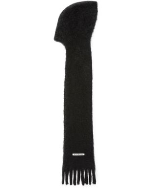Reveal Acne Studios's fringed scarf, a statement piece defined by its soft fringed edges and distinctive front logo. This accessory effortlessly elevates any ensemble, blending modern design with subtle branding for a refined, contemporary look.