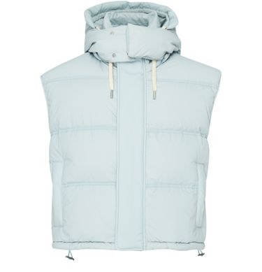 Sleeveless down jacket features an oversized shape, providing a relaxed and comfortable fit. It includes an adjustable drawstring hood and a mockneck, offering both style and functionality. The snap-button fastening and concealed zipper closure ensure a secure and seamless closure. Additionally, it features side pockets for added convenience.