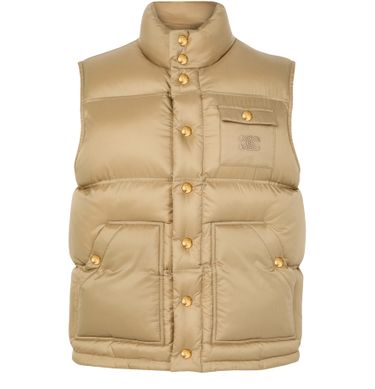 Introducing Celine's sleeveless puffer jacket in ripstop nylon, a perfect blend of style and function. With its loose fit and high collar, this piece features Triomphe embroidery, a stylish patch pocket, and eight Triomphe snap buttons, offering a modern edge to any wardrobe.
