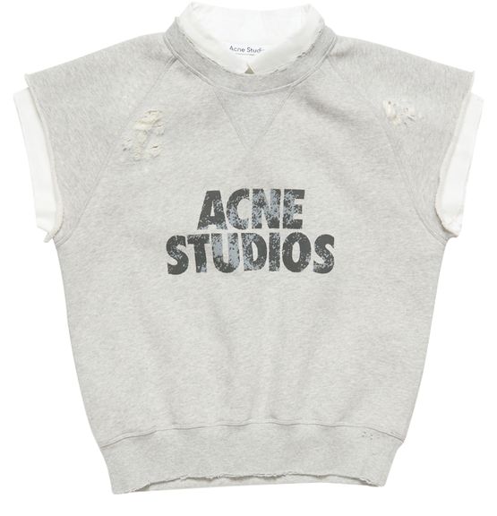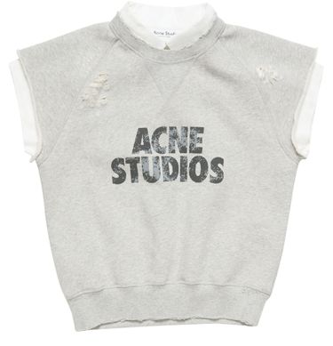 Reveal Acne Studios's cropped sleeveless sweatshirt, featuring a crew neck and a bold printed logo at the front. The modern silhouette and soft texture make it a standout piece, perfect for layering or pairing with high-waisted bottoms for a fresh, urban look.