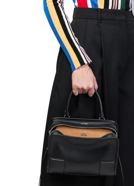 Reveal Loewe's small soft calfskin Amazona 180 bag, crafted from smooth leather with double handles for versatile carrying. The visible stitching and silver finish highlight its refined design, while the zippered front pocket and spacious interior compartment offer both style and practicality.