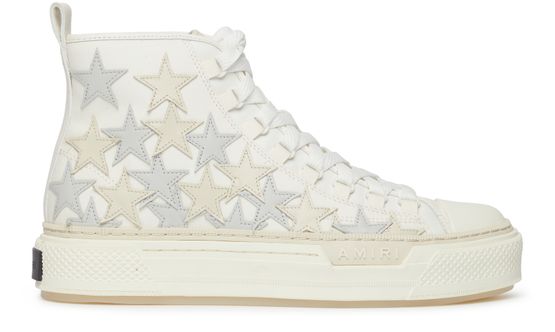 Amiri's Stars high-top sneakers are lace-up shoes with a thick outer sole for optimal comfort and durability. They feature a back loop for easy slipping on and off, along with contrast details that add a stylish touch. The logo on the side and on the tongue further enhance the overall design of these trendy sneakers.