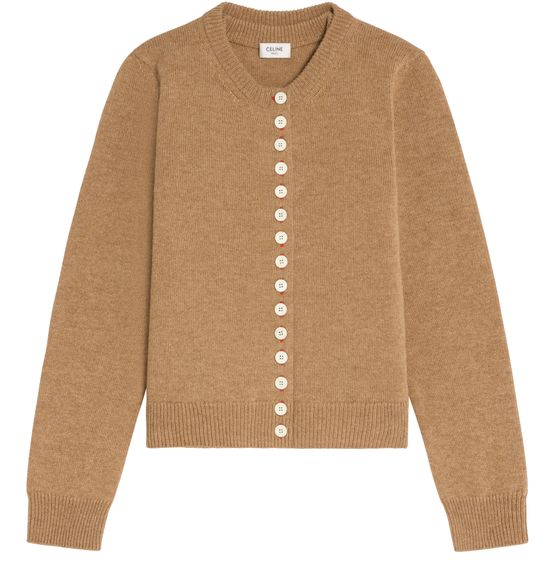 • Description : Sleeveless top and cardigan, crew neck, ribbed trim, 15 celine-engraved horn buttons, reference : ry0ng317v.02cm.