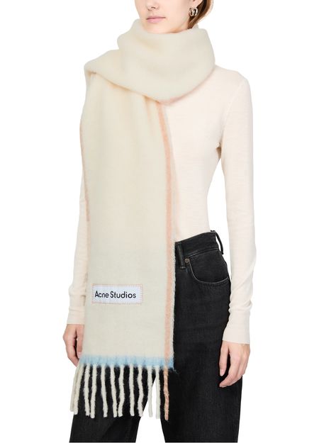 Reveal Acne Studios's wool mohair scarf, a masterpiece of style with its fringed edges and contrasting color stripe. The front logo adds a touch of sophistication, making it a must-have accessory for any wardrobe.