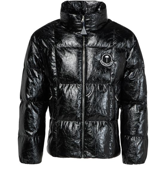 Moncler's x Palm Angels Simoon metallic coated down jacket combines style and functionality. With a high neck and long-sleeved design, it features a zipper closure and padded texture for warmth. Side pockets offer convenience, while the chest and back leather logos add a touch of luxury to this striking puffer jacket.
