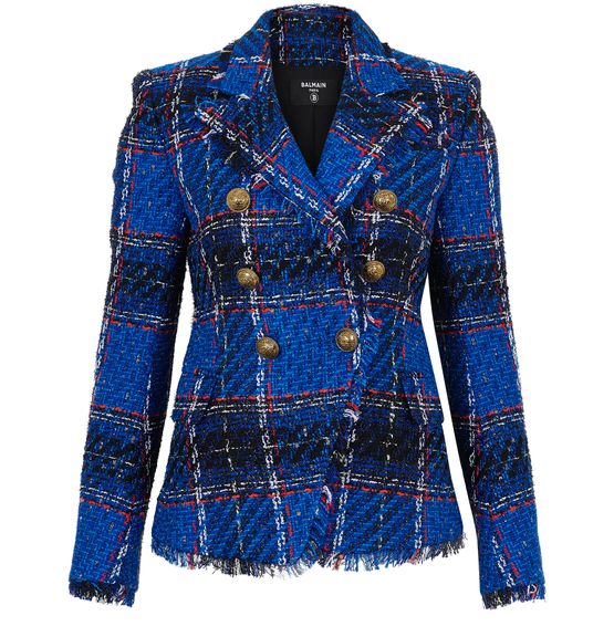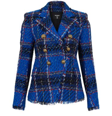 This six-button tweed jacket is a Balmain signature design. The French fashion house offers a piece with lots of personality, featuring a colorful fabric with very short fringes.