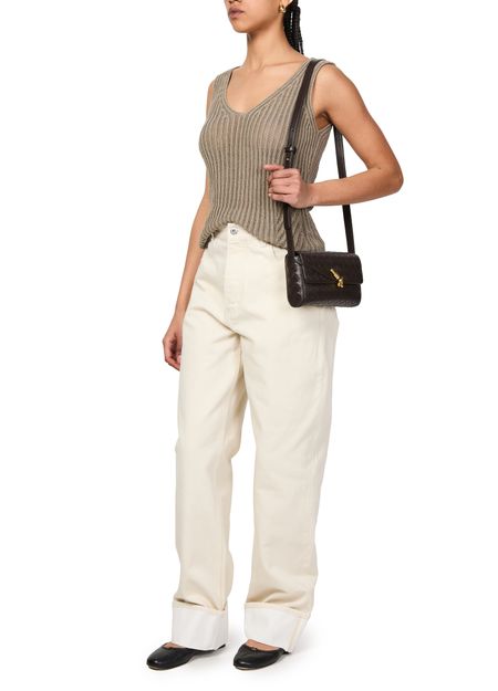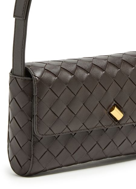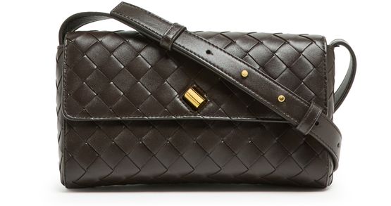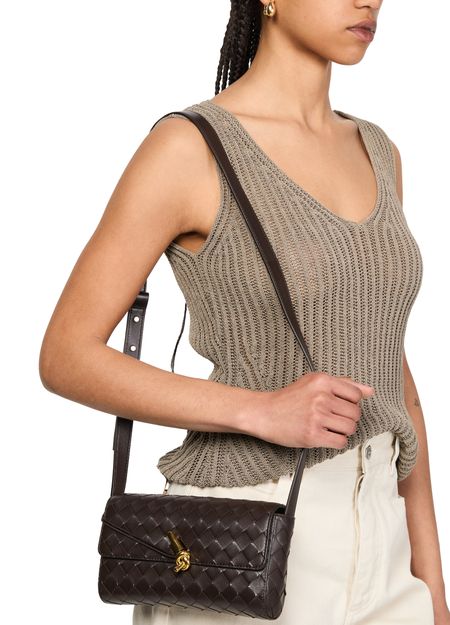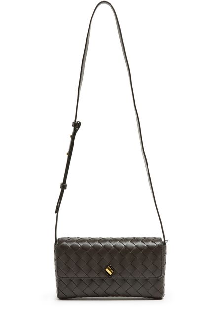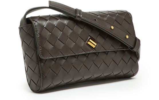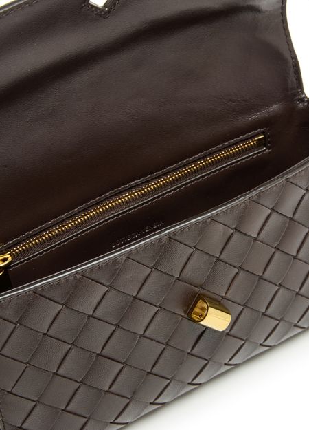 Introducing Bottega Veneta's Andiamo clutch, a masterpiece of modern elegance. This mini bag boasts a flap closure and visible topstitching, enhanced by a gold finish and printed logo. With its adjustable strap and zippered interior pocket, it seamlessly transitions from day to night.