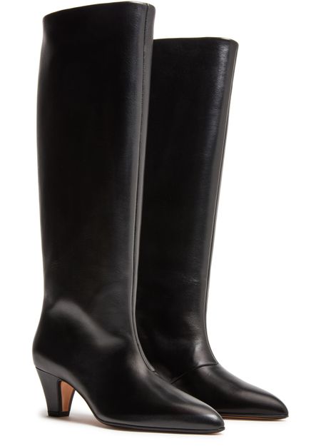 • Description : Boots, smooth leather, block heel, medium heel, closed, pointed toe, visible stitching.