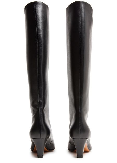 Discover Bally's Arval boots 55, crafted from smooth leather with a sleek pointed toe and closed design. These boots feature a medium block heel, offering both style and comfort. Visible stitching adds a touch of sophistication, making them a perfect addition to any modern wardrobe.