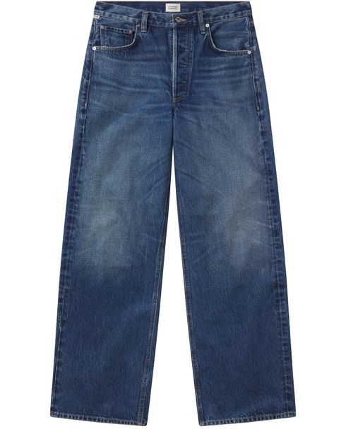 Description : buttoned and concealed zipper closure, back leather logo, contrast stitching, belt loops, loose fit, ankle length, denim, five-pocket style, low-waisted fit.