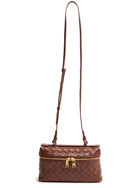 Bottega Veneta's Bang Bang vanity case combines elegance and functionality with its zipper closure and single compartment design. Crafted with visible topstitching and a gold finish, it features double handles and a detachable strap for versatile carrying options. Ideal as a toiletries bag or cosmetics pouch, it effortlessly elevates any ensemble.