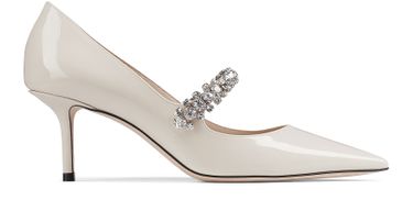 Jimmy Choo's Bing 65 pumps feature a pointed toe with visible stitching and a crystal-embellished strap for a touch of glamour. The logo-printed insole adds a luxurious feel, while the very thin sole and stiletto heel provide a sleek silhouette. Contrast details and metal finishes give these pumps a modern edge.