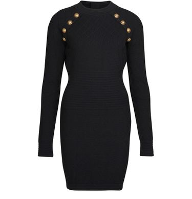 This buttoned dress with raglan sleeves, conceived by Balmain, defines the silhouette with its streamlined shape and the belted effect created by its horizontal ribbing.