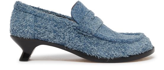 Loewe's Campo loafer 40 is a closed-toe design with visible stitching and a low heel. It features an engraved logo, pull-on design, round toe, and contrasting sole. The loafers have a logo-printed insole and a unique heel for added style.
