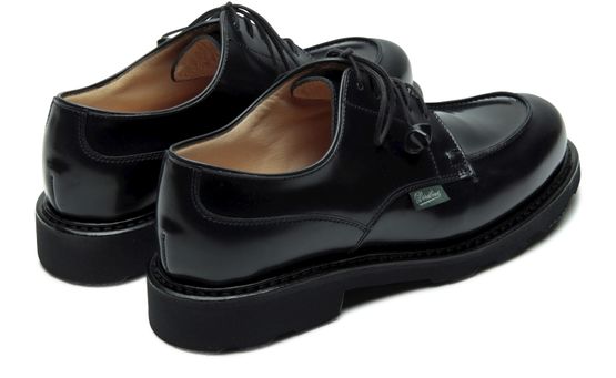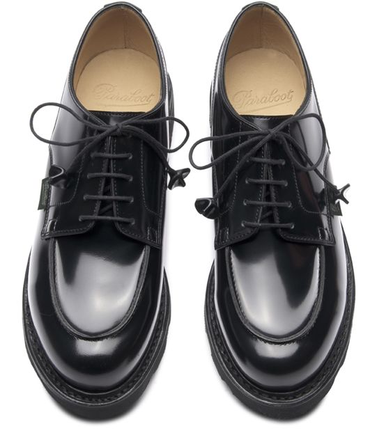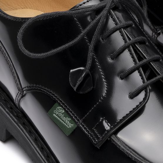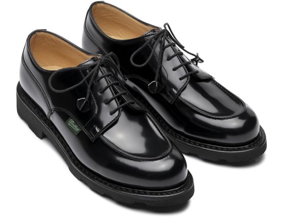 Introducing Paraboot's Chambord derbies, a refined choice featuring a low block heel and embossed logo. Crafted with a contrasting sole and visible stitching, these lace-up shoes offer a classic round toe and closed design, perfect for stylish comfort.