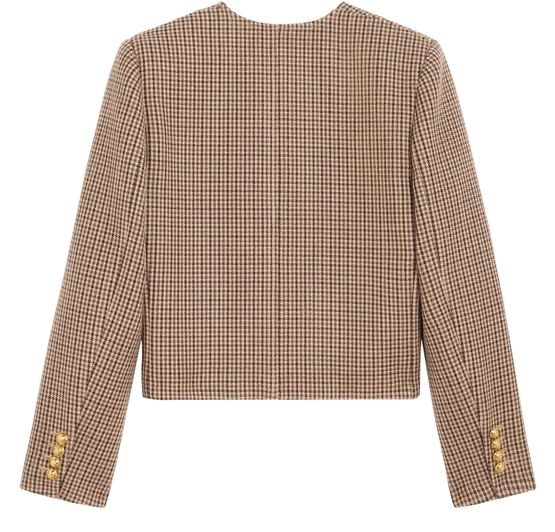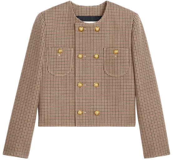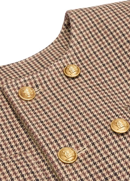 Celine's Chelsea jacket in double houndstooth wool is a sophisticated staple, tailored with shoulder pads for a structured silhouette. Featuring a crew neck and rounded patch pockets on the chest, it is adorned with Celine blason buttons for a refined touch. Made in France, this piece embodies timeless elegance and style.