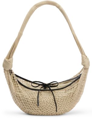 Lemaire's Croissant filt shoulder bag is a chic mini bag designed for versatility. Featuring a magnetic closure and a single handle, it can be hand carried or worn on the shoulder. The wide strap adds comfort, while the appliquéd logo and visible topstitching enhance its sophisticated appeal.