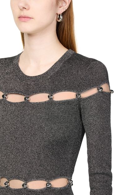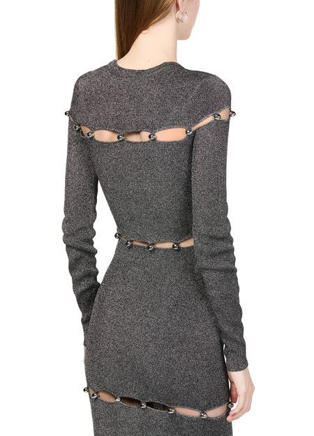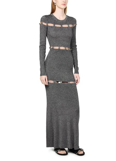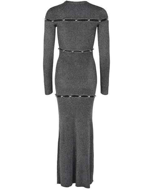 • Description : crew neck, visible stitching, silver finish, knitted dress, long-sleeved, appliquéd logo, studded details, maxi dress, highlighted waist.
