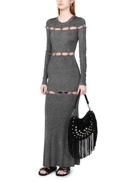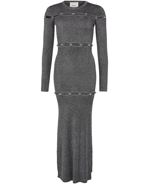 Isabel Marant's Elmire long dress showcases a crew neck and long-sleeved silhouette, perfect for effortless elegance. With visible stitching and studded details, this knitted maxi dress highlights the waist beautifully. An appliquéd logo adds a touch of sophistication, while the silver finish elevates its chic appeal for any occasion.