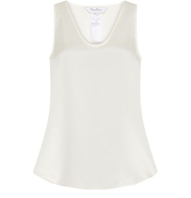 Max Mara's Filly satin top showcases a sleeveless design with a round neck, perfect for layering or wearing solo. Its regular length flatters the silhouette, while the appliquéd logo adds a touch of elegance. Visible stitching enhances its refined look, making it an essential piece for any chic wardrobe.