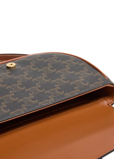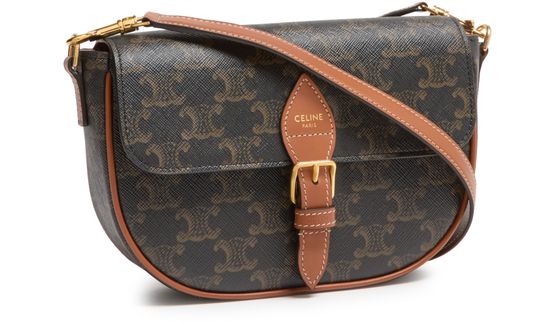Discover Celine's Folco shoulder bag in Triomphe canvas and calfskin, a versatile piece with gold finishing. Designed for both shoulder and cross-body carry, it features a magnetic closure, decorative buckle, and two removable straps. A main compartment, inner flat pocket, and adjustable strap complete its functionality.