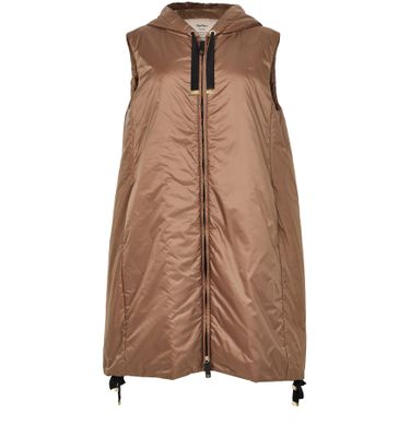 Unveil Max Mara's Greengi sleeveless down jacket - THE CUBE with its sleek oversized fit and knee-length design. The puffer style features a padded texture, complemented by a practical zipper closure and a cozy hood. Perfectly versatile, this jacket transitions effortlessly from casual outings to chic city strolls.