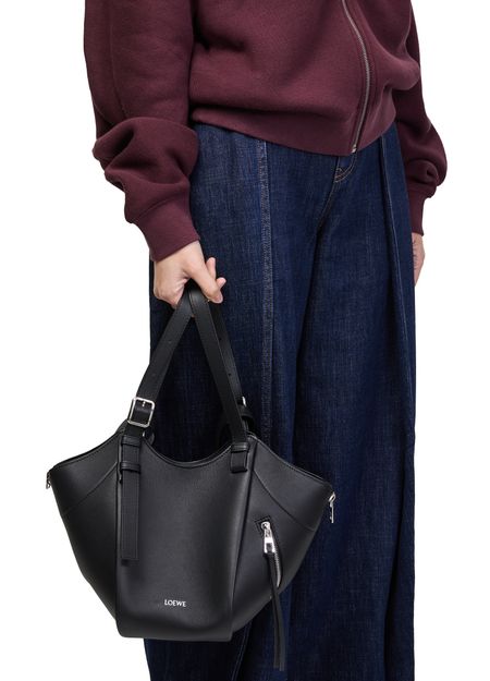 Reveal Loewe's Hammock Flip bag, crafted from smooth leather with double handles for versatile carrying. The visible stitching and silver-finish logo on the front add a refined touch, while a zippered front pocket and spacious interior compartment ensure both style and practicality.