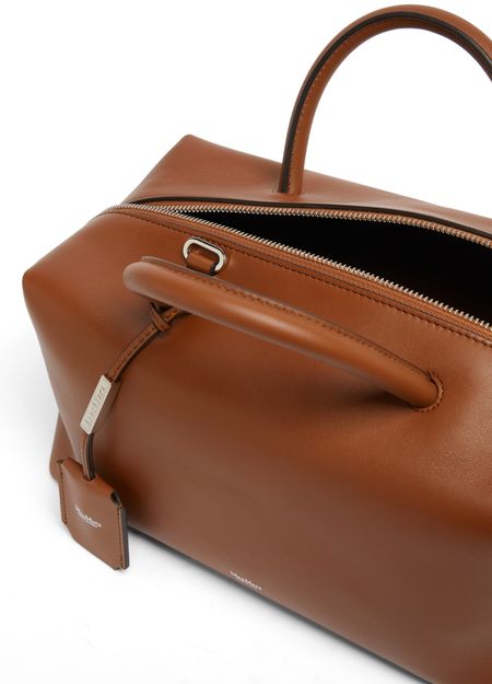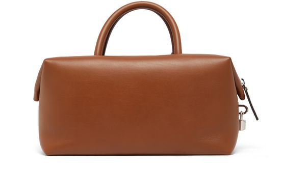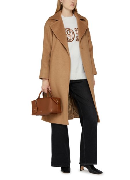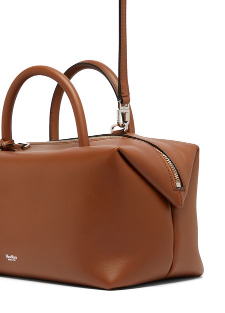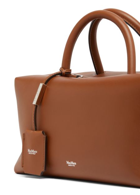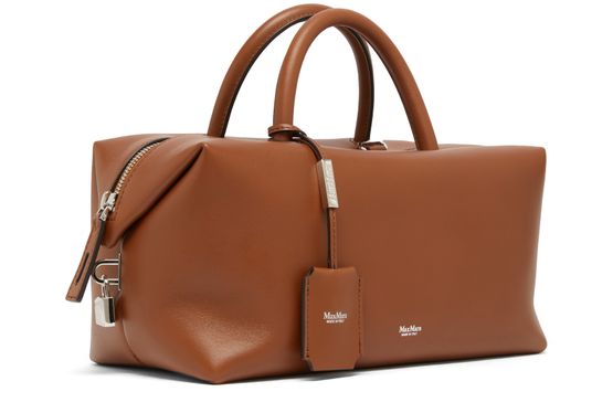 Max Mara's Holdall top-handle leather bag exudes elegance and sophistication. Crafted with visible stitching and a carabiner detail, it features a printed logo with silver letters. The front logo adds a touch of luxury, while the zipper closure ensures security. With visible topstitching and a detachable strap, it can be hand-carried or worn on the shoulder with a thin strap. The silver finish gives it...