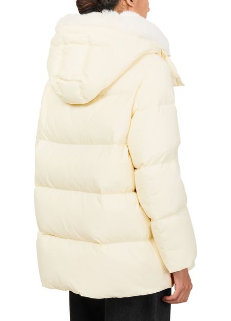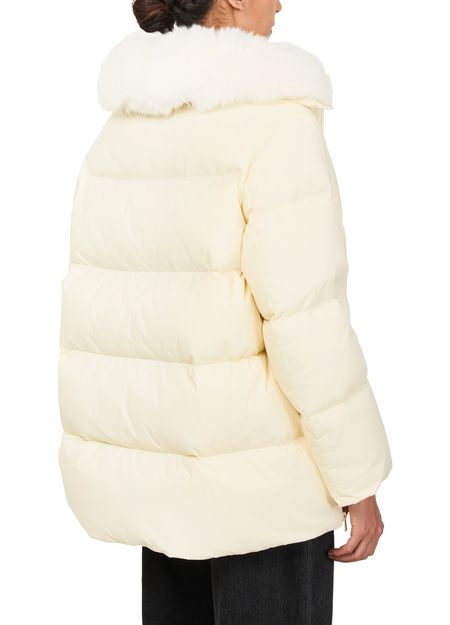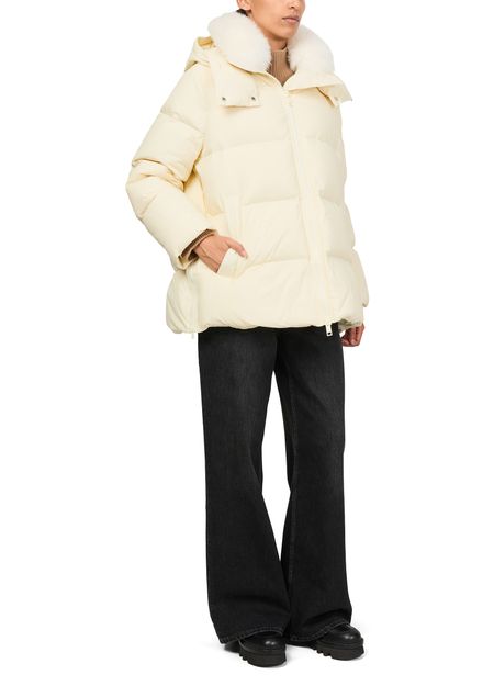 Unveil Yves Salomon's hooded puffer jacket with a fox fur collar, showcasing an oversized fit and short length for modern appeal. A padded texture and long sleeves add warmth, while side pockets and a zipper closure ensure practicality. This versatile piece transitions effortlessly from casual outings to formal settings.
