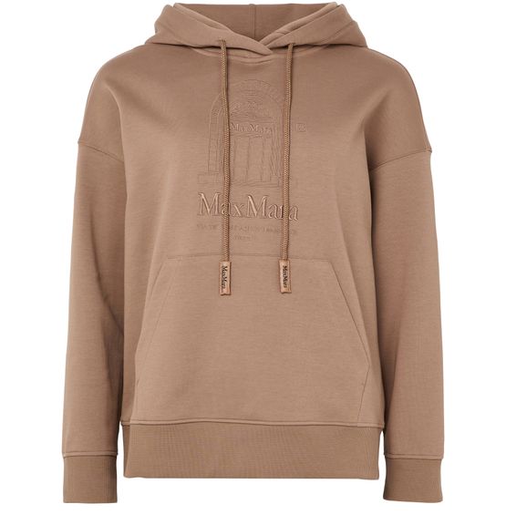 Reveal S Max Mara hooded sweatshirt, featuring a high-neck with an adjustable drawstring and a sleek embossed front logo. The long silhouette and kangaroo pocket add both comfort and style, making it a versatile piece for layering or standalone wear in any modern wardrobe.